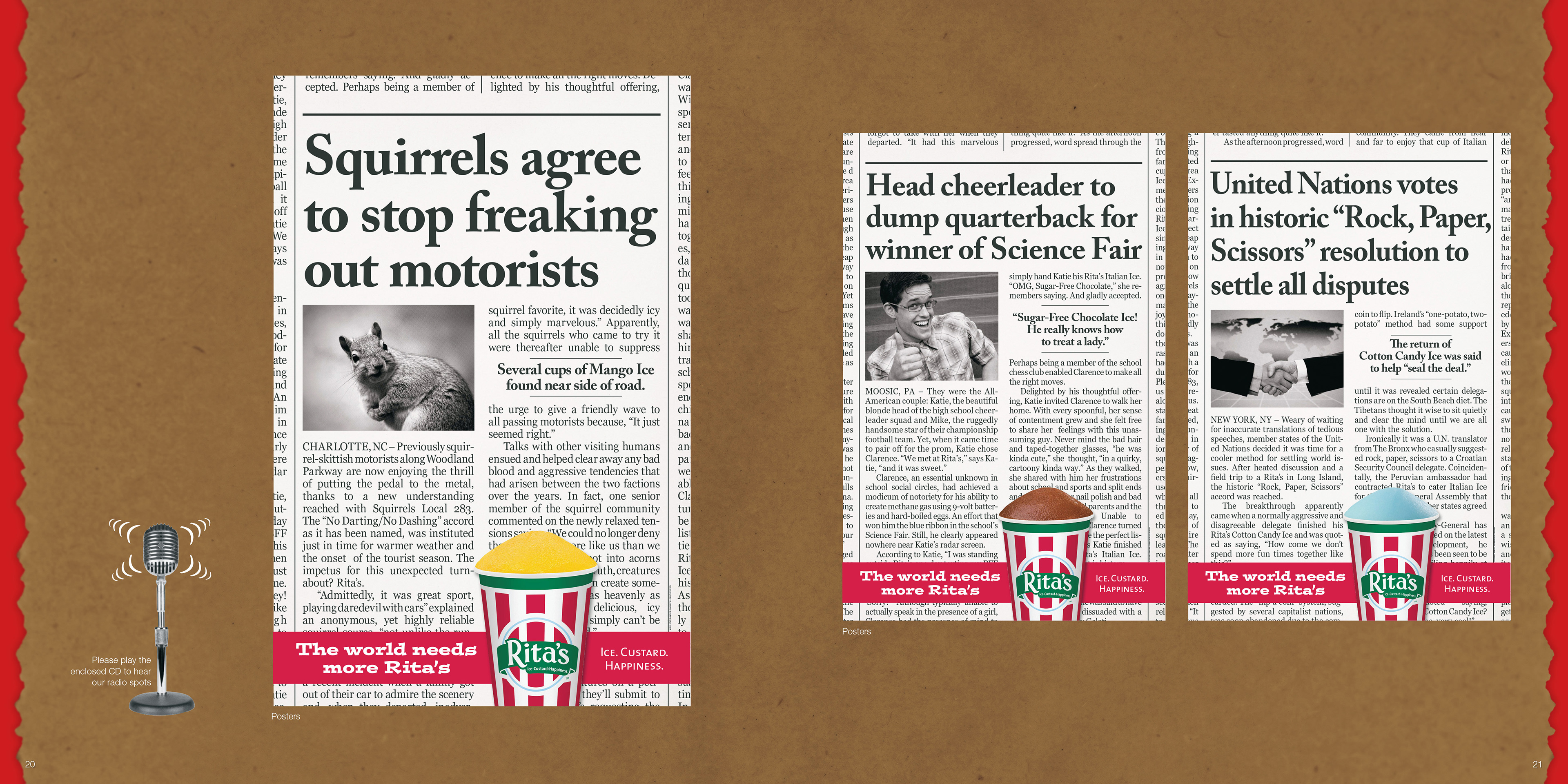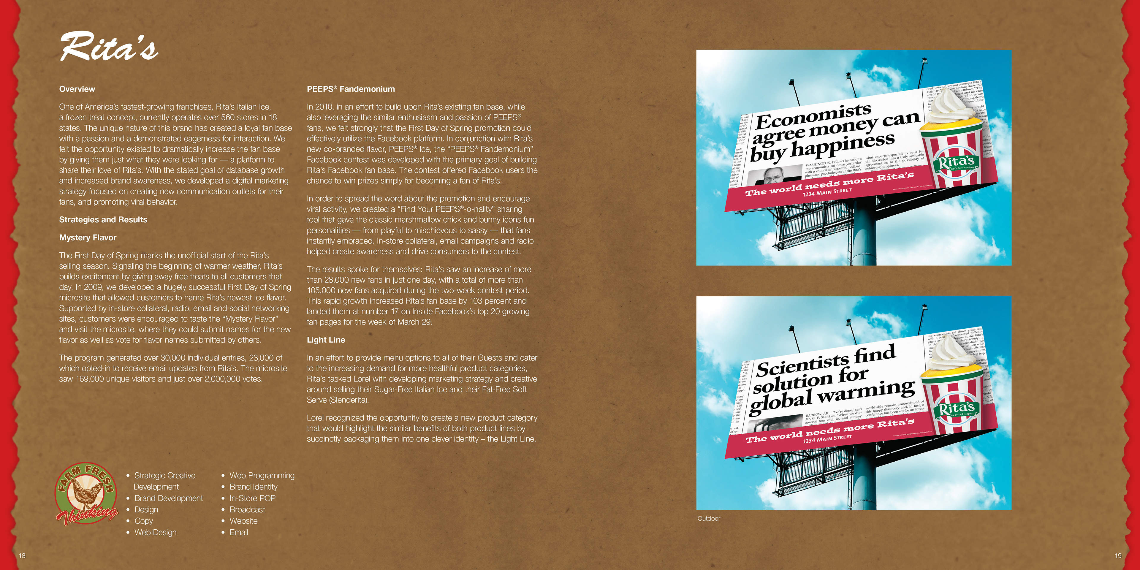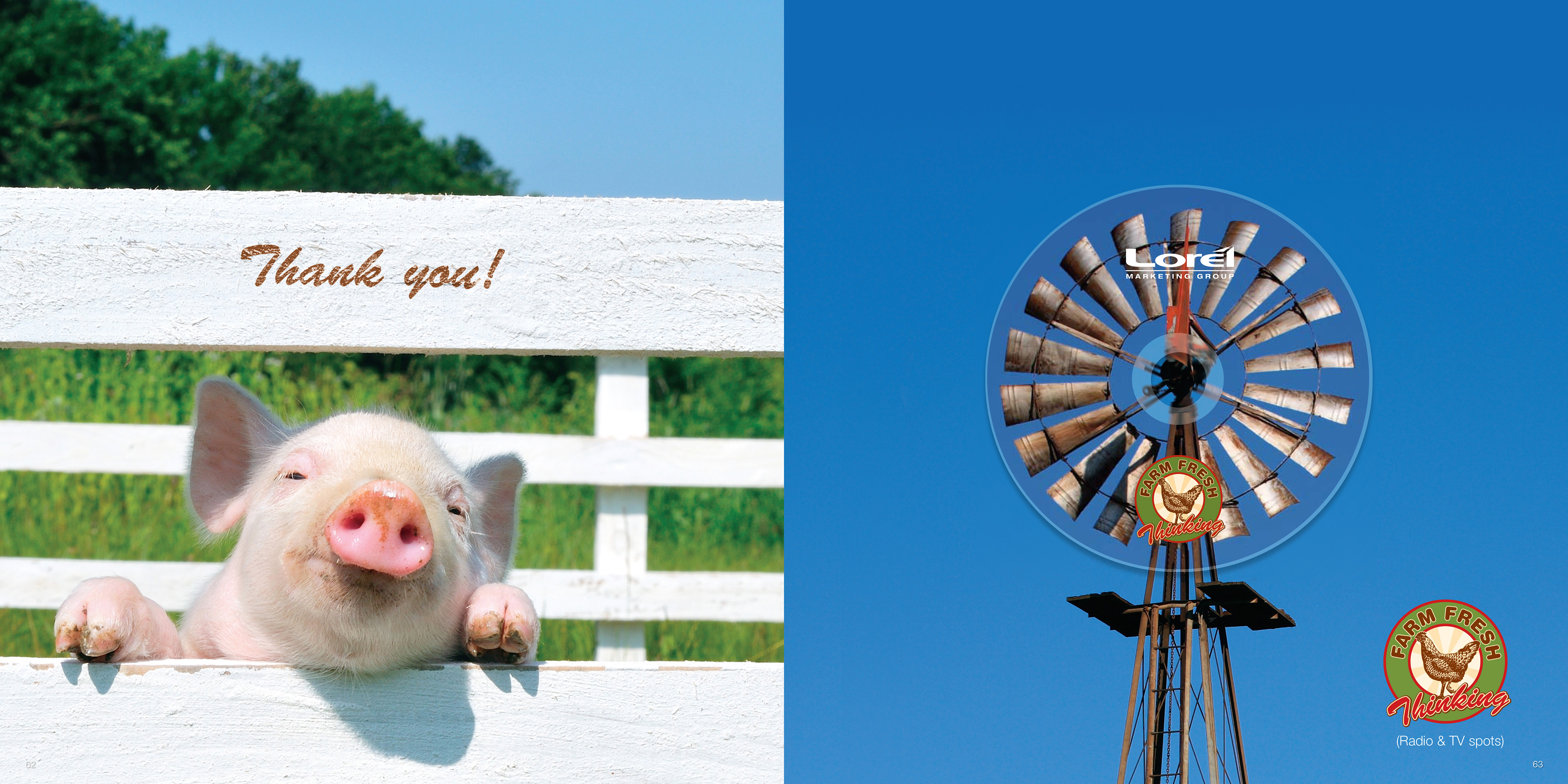 Selected pages and spreads from an agency new business presentation booklet. The following contains presentation creative elements: Farm Fresh Thinking logo, concepts, client-specific work, and copy, that I was responsible for creating or working on as part of client creative teams.