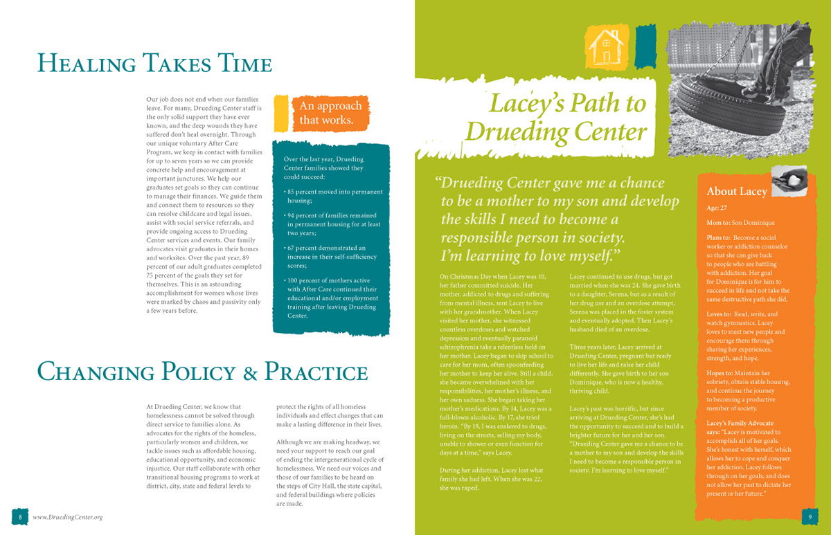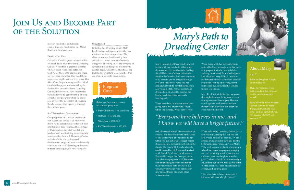 28th Annual Healthcare Advertising Awards Merit Award Winner. A collaborative effort with members of the Drueding Center account design team. The challenge for my portion of the project was to take the initial concept and elements, and design a final piece that showcased certain success stories, garnered fundraising support for the center, and was created in a way that the client could effortlessly oversee print and distribution of the brochure on their own.